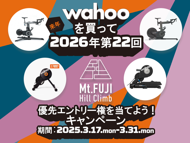 | Wahooを買って”2026年 第22回 Mt.富士ヒルクライム” 優先エントリー権を当てよう!キャンペーン | 期間内にWahoo国内正規販売店で対象スマートトレーナー/バイクをご購入・応募 | 抽選30人(最大) | スマートトレーナー/バイク購入費用 |